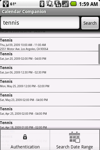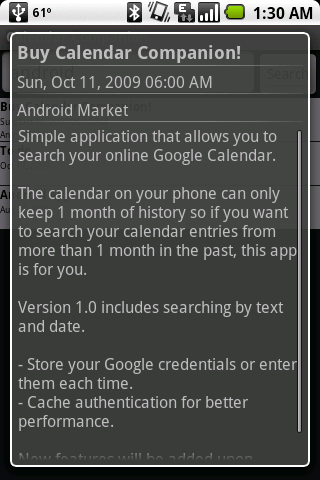 Simple application that allows you to search your online Google Calendar. The calendar on your phone can only keep 1 month of history so if you want to search your calendar entries from more than 1 month in the past, this app is for you. Contact me at CalendarCompanion@BabakMozaffari.com Click here to go to the personal website of Babak Mozaffari (the developer) Global Search Calendar Companion supports the built-in search feature that Android provides in version 1.6 onwards, however it limits the search to the local database on your phone for performance reasons. To enable global search for Calendar Companion, press the menu button and go to Settings | Search | Searchable item and make sure "Calendar Companion" is selected. Android's global search uses a ranking algorithm and when you first enable search for Calendar Companion, it has a very low ranking. As such, you will have to scroll all the way down and expand calendar search results under "More results...". Continually selecting Calendar Companion results gradually increases its ranking and causes results to immediately show up at the top of the list. Selecting a response takes you to the corresponding calendar entry in your native calendar. Privacy Policy See the application privacy policy here. |